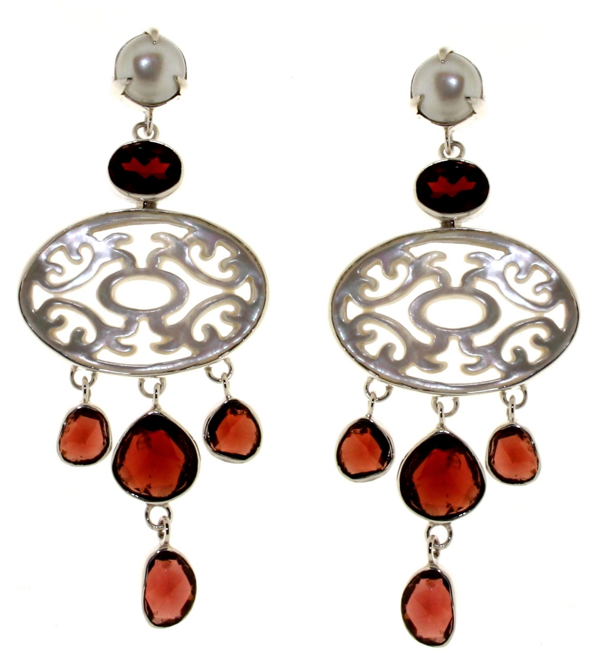 Earrings in 925 silver with engraved Mother of Pearl, freshwater Pearls and Garnets