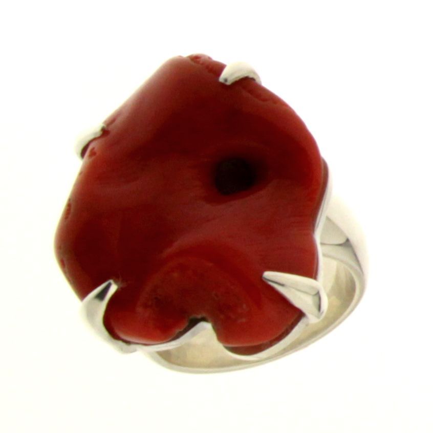 Anello con Corallo Rosso a Sasso del Mar Mediterraneo, montatura a vista con Griffes - Misura 13