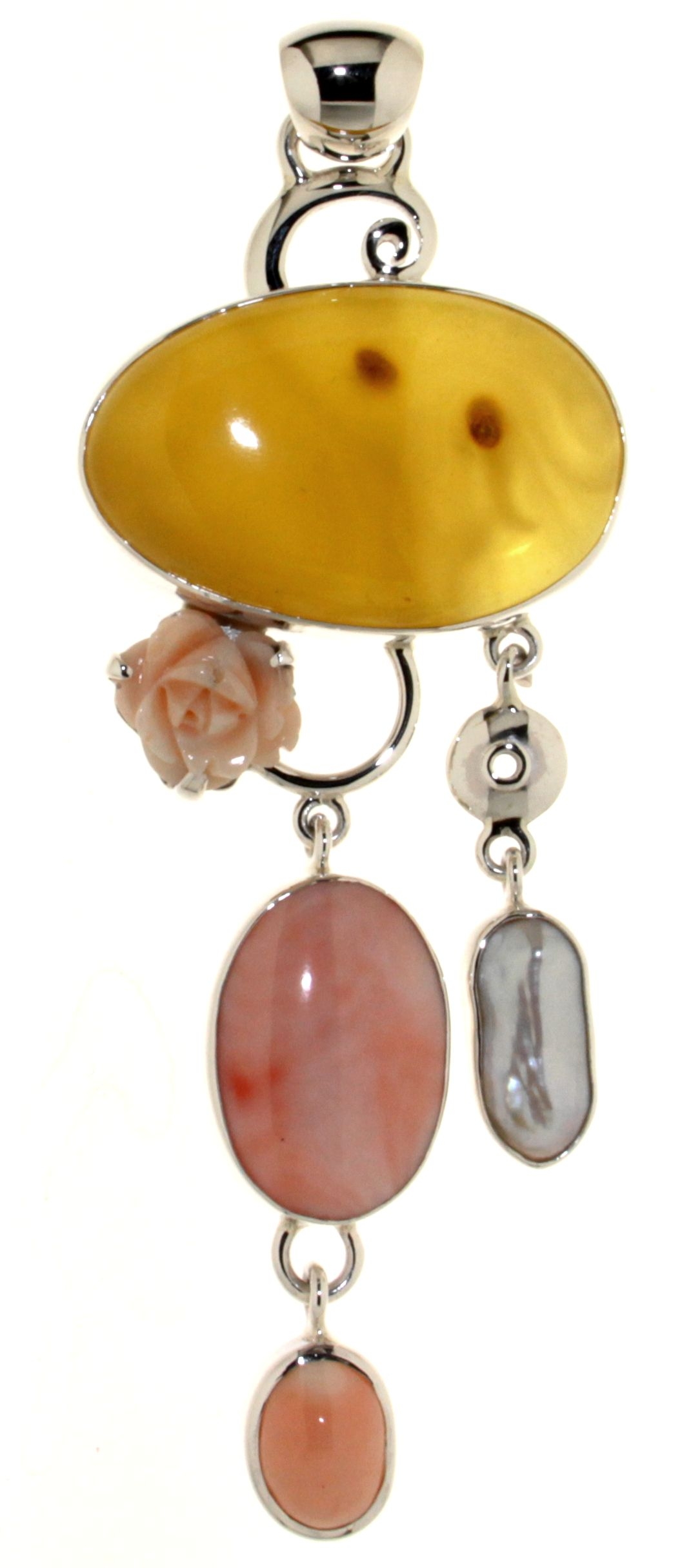 Pendente con Ambra del Baltico, Corallo rosa, Perla e Rosa di Corallo