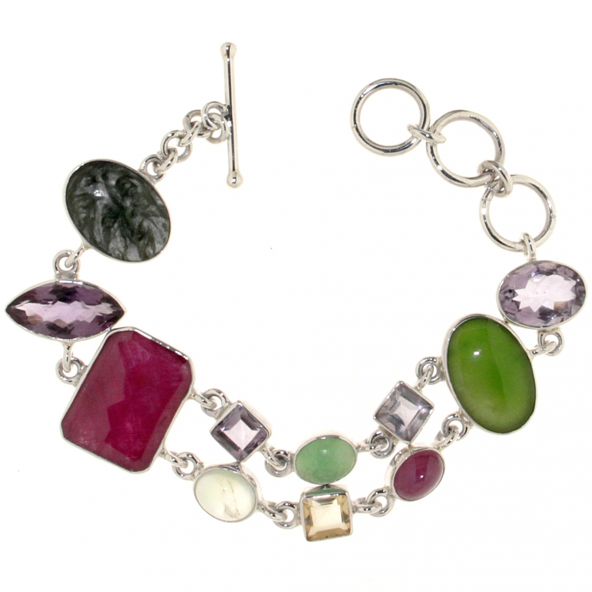 Bracelet in 925 Silver with Serafinite, Ruby, Amethyst, Citrine Quartz, Prehnite, Chrysoprase and green Onyx