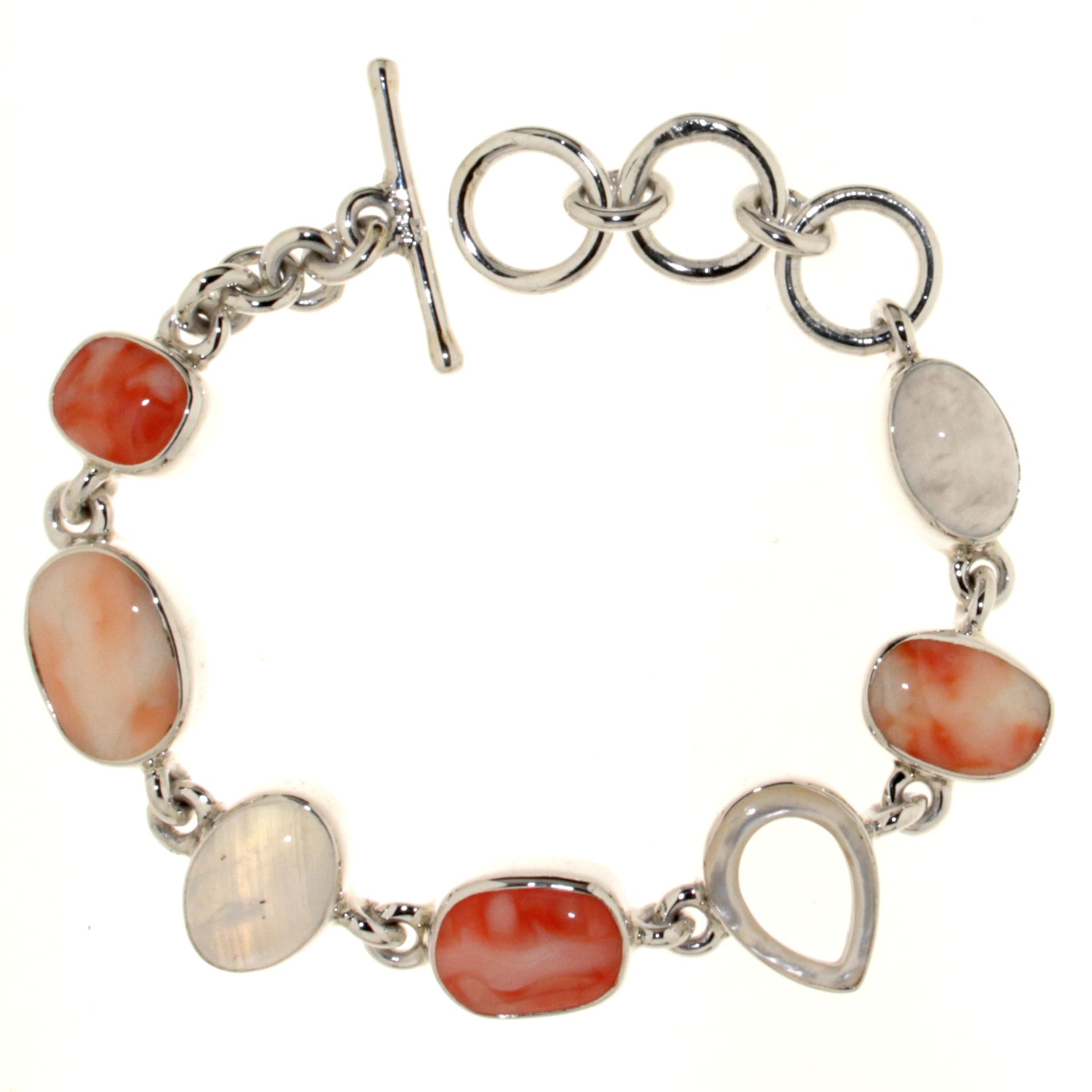 Bracelet in 925 Silver with Pink Coral, White Coral, Mother of Pearl and Chalcedony