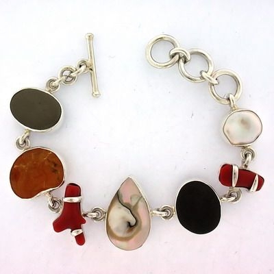 Bracelet in 925 silver, shell, coral, amberstones and pearls