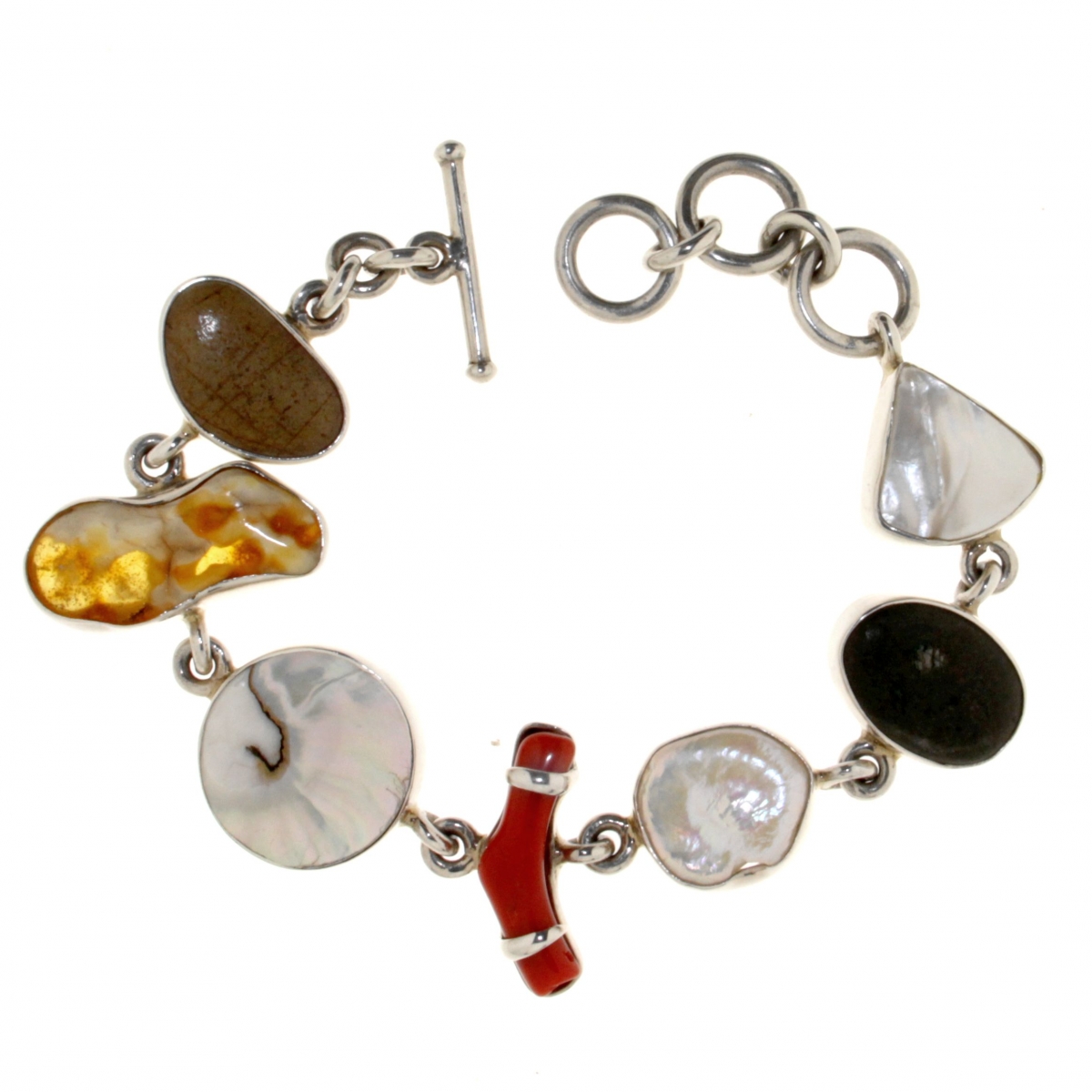 Bracelet in 925 silver, shell, coral, amber, stones and freshwater pearls