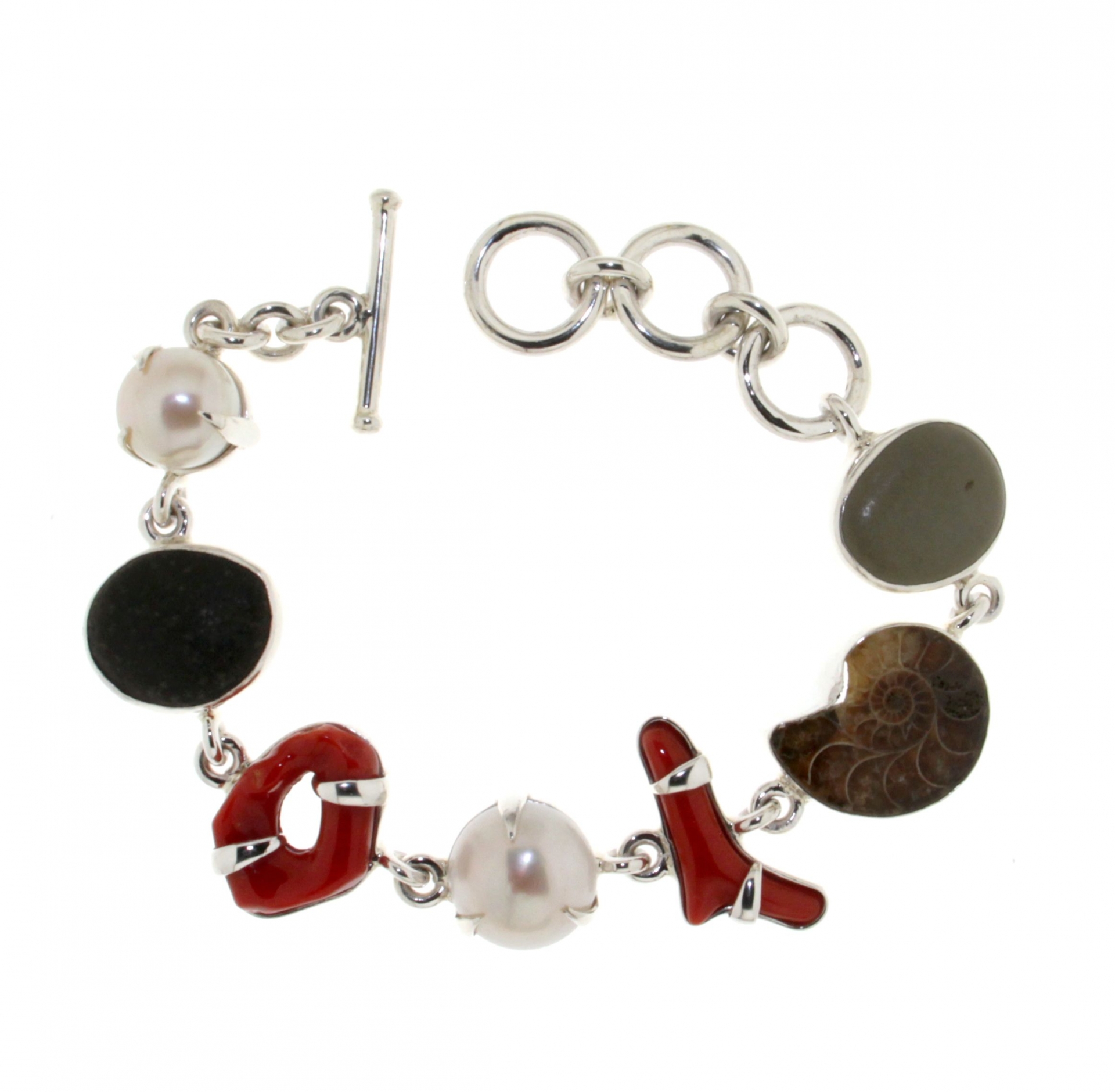 Bracelet in 925 silver with Coral from the Mediterranean Sea, Pebbles from the Tuscan Coast, Fossil Ammonite and Freshwater Pearls
