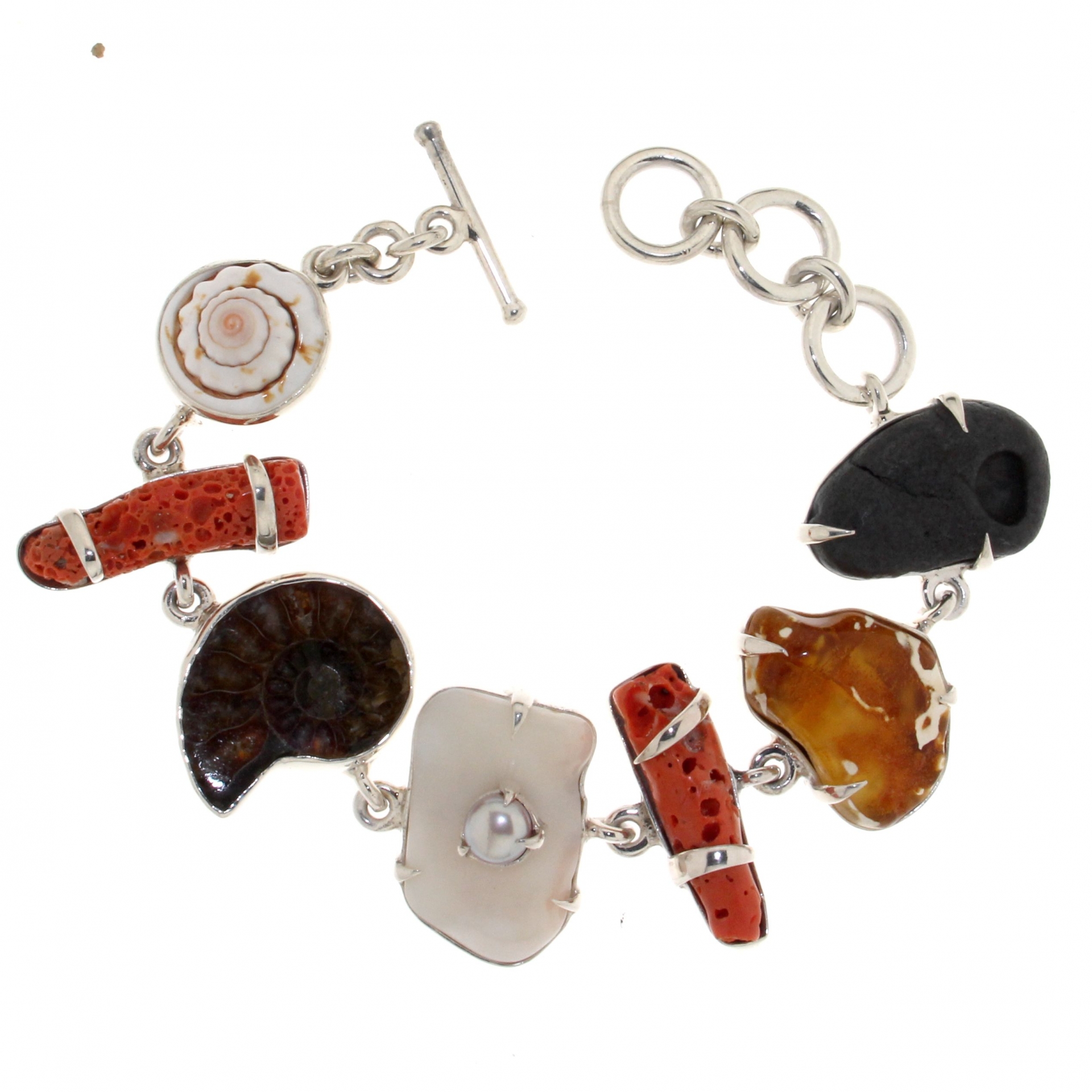 Bracelet in 925 silver, shell, coral, stones, amber, ammonite and freshwater pearl