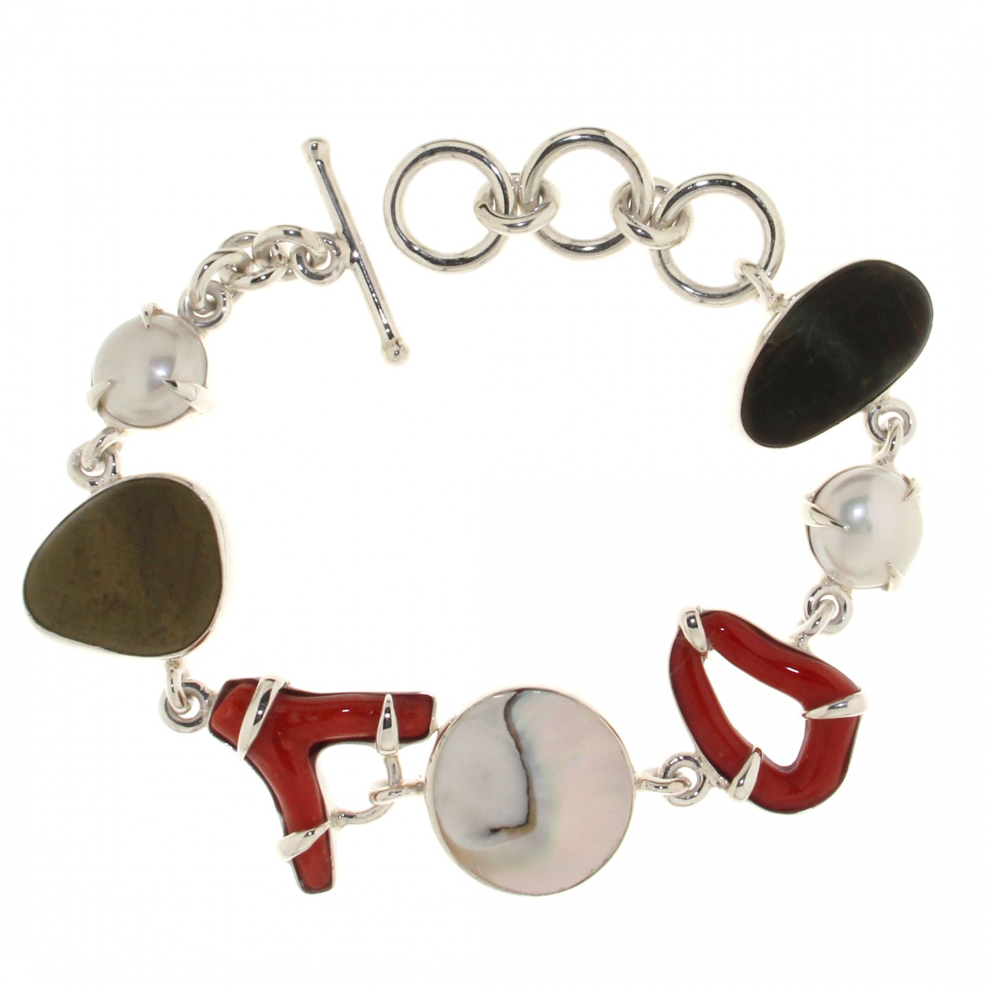 Bracelet in 925 silver, shell, coral, freshwater pearls and stones