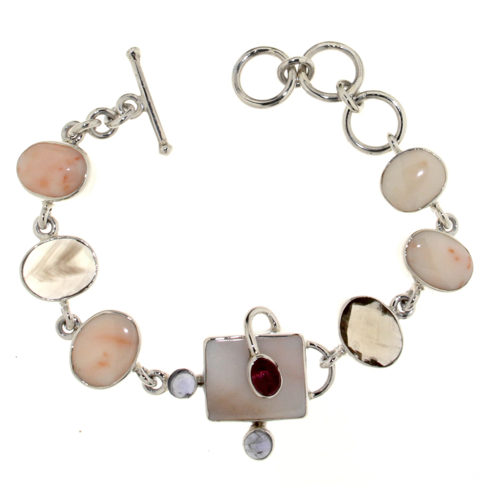Bracelet in 925 Silver with White Coral, Mother of Pearl, Smoky Quartz, Pink Tourmaline and Iolite