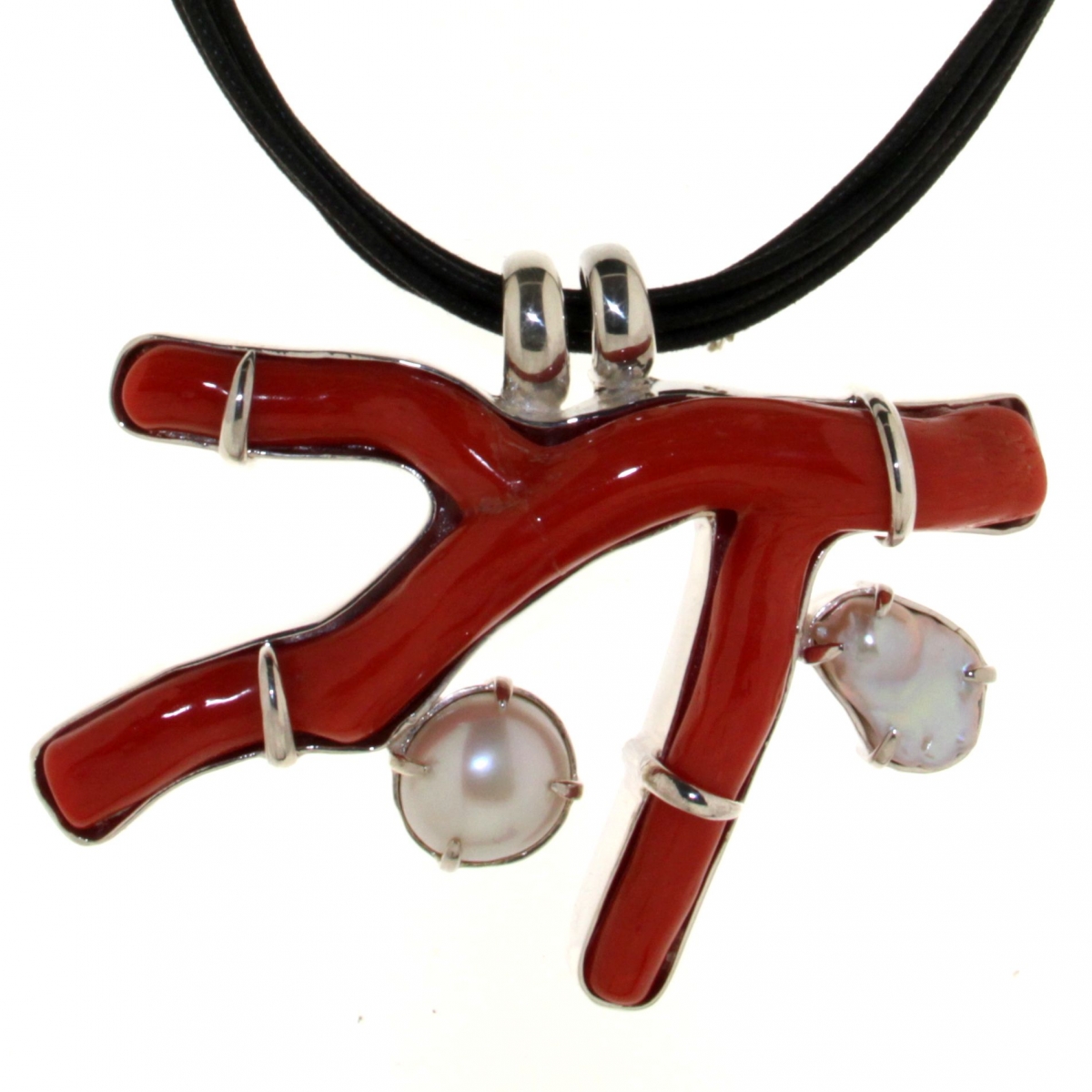 Necklace in 925 silver with Red Coral branch from the Mediterranean sea and freshwater Pearls