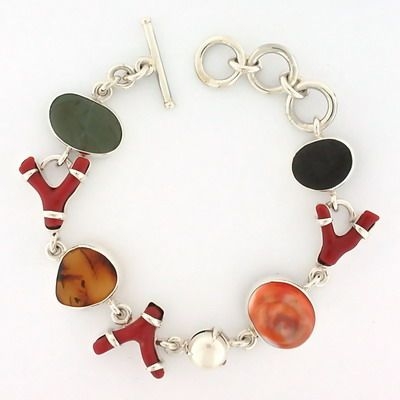 Bracciale con Ambra Grezza, Opercolo, Sassi, Perle e Corallo Rosso