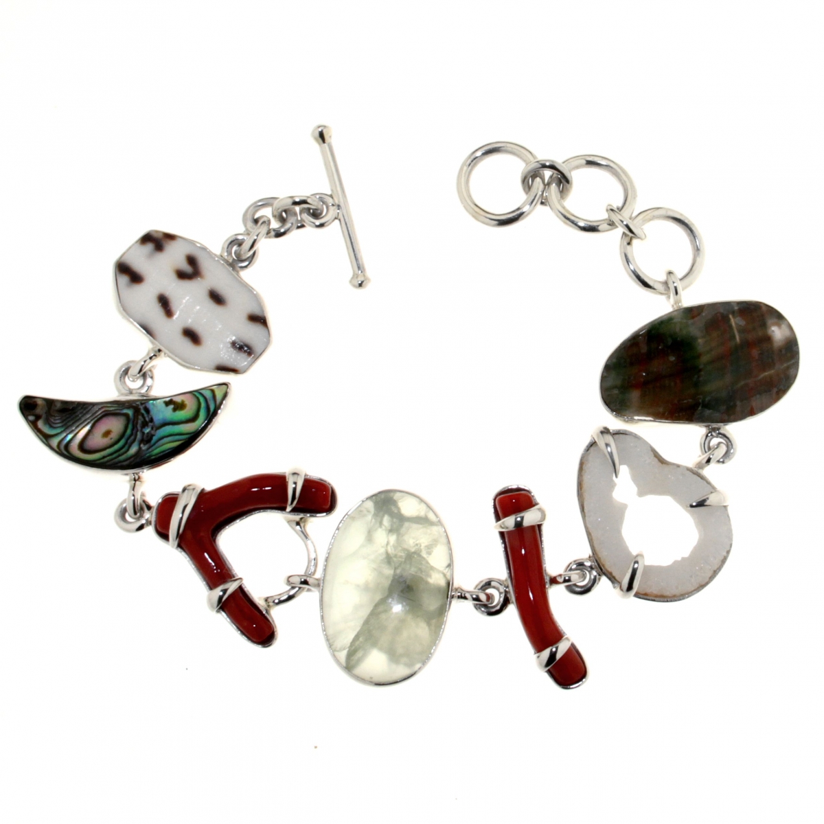 Bracciale in argento 925, corallo, conchiglie e pietre