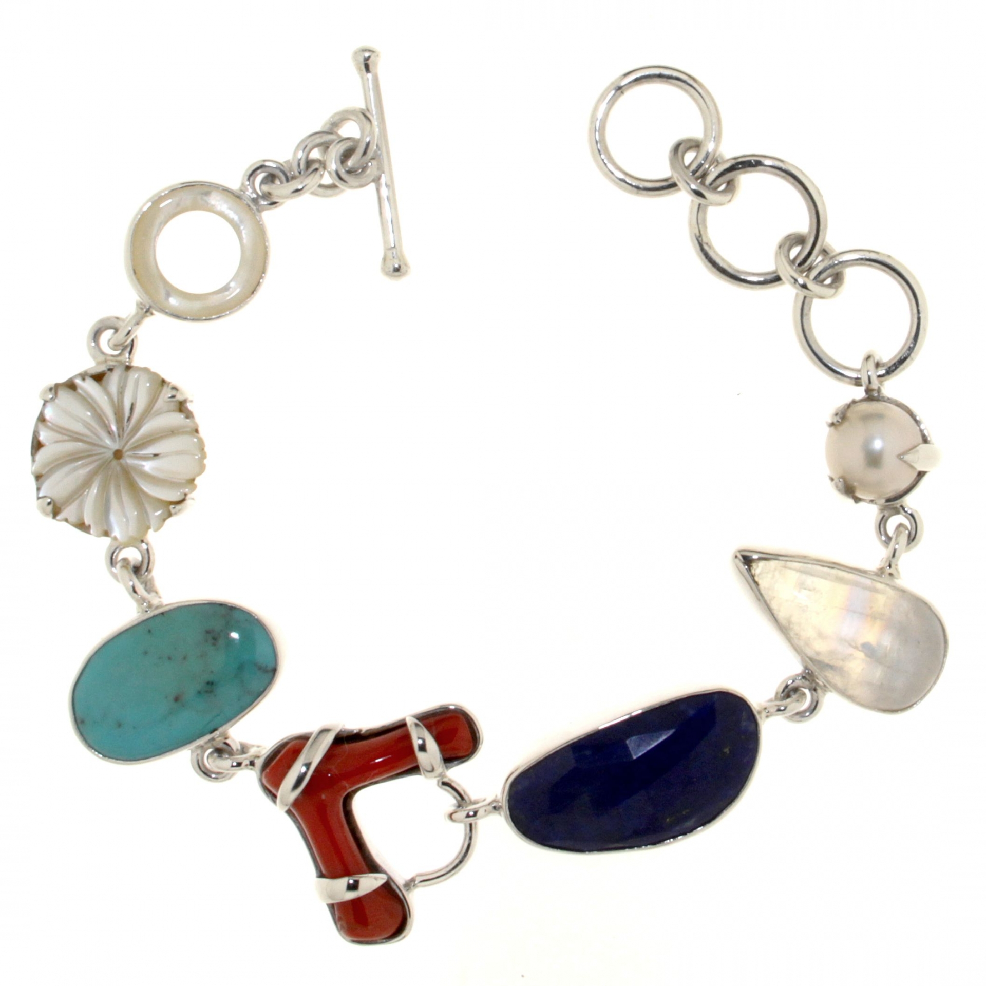 Bracciale in argento 925, pietre, corallo, perla e madreperla