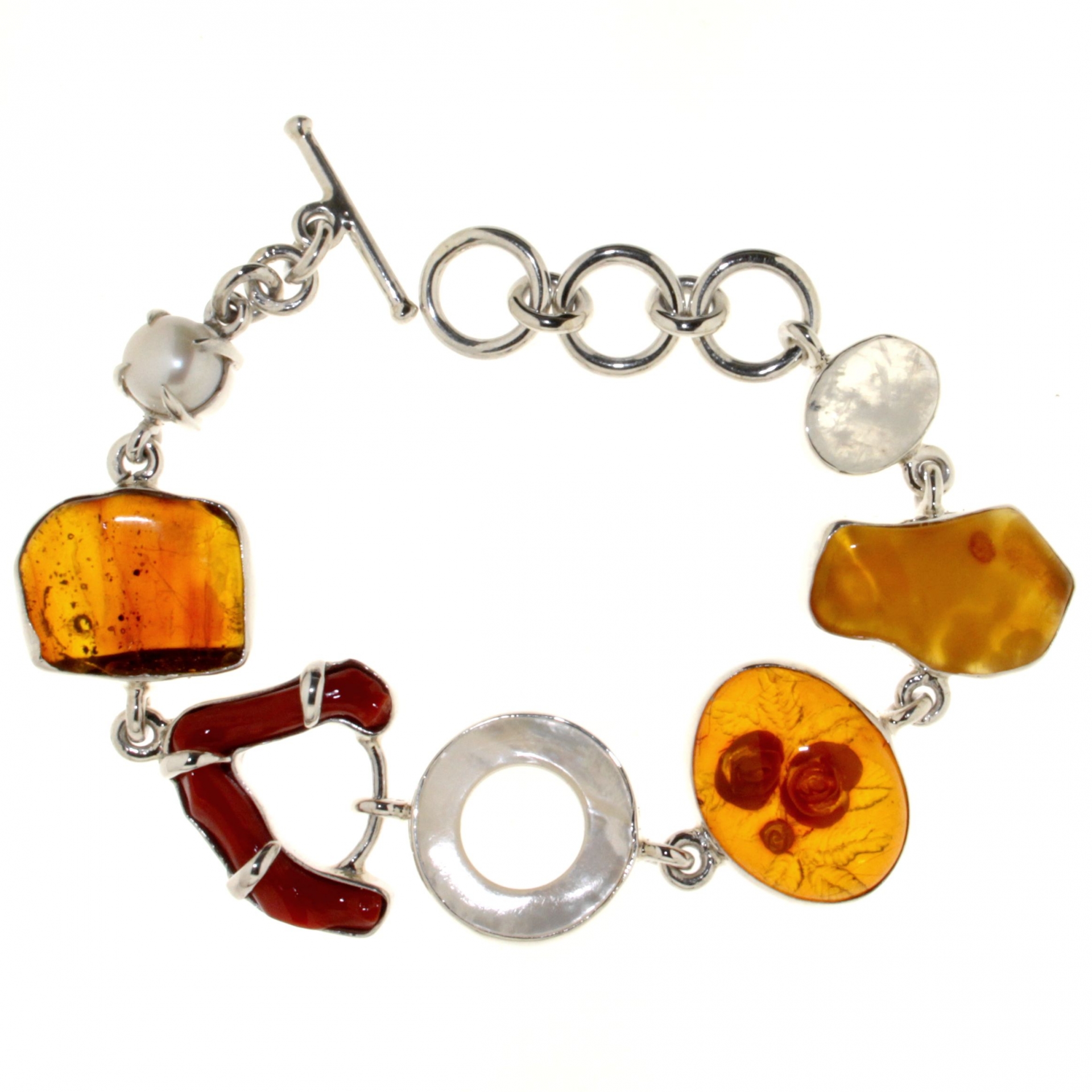 Bracciale in argento 925, corallo, ambra, madreperla, perla e pietra