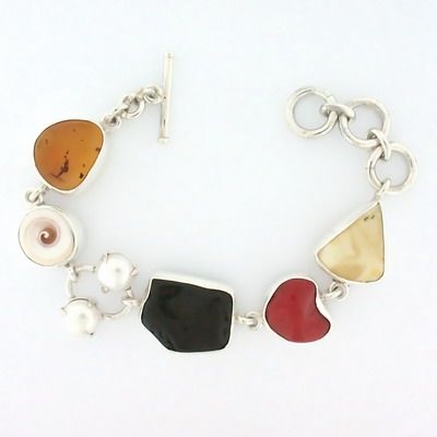 Bracciale con Ambra Grezza, Conchiglia a Spirale, Perle e Corallo Rosso
