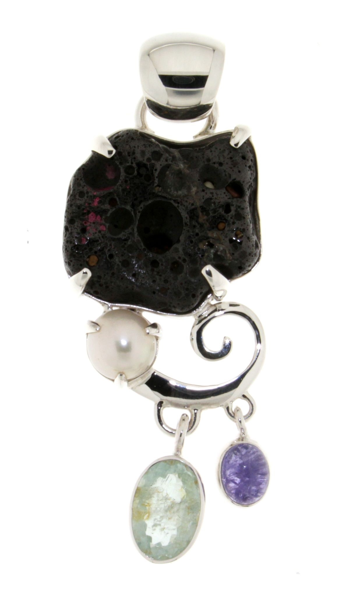 Pendente con Frammento di Ferro Fuso dagli Etruschi, Acquamarina, Tazanite e Perla